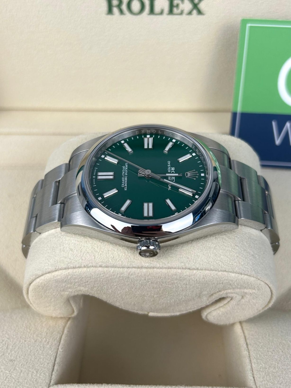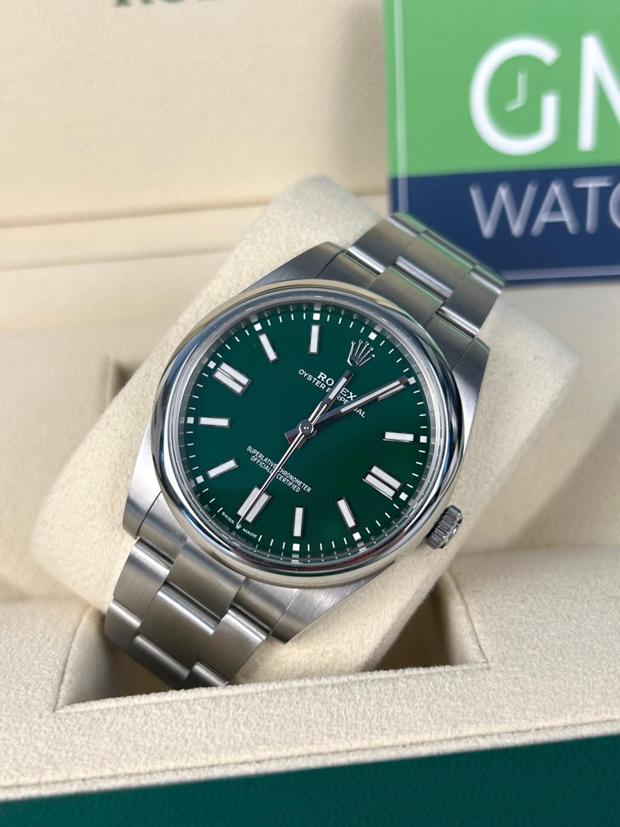 Model Reference: 124300 Model Year: 2024 Dial: Green Case Material: Steel Full Set – Includes Watch, Green Rolex Card, Outer Box, Inner Box, Manual, Booklet, Wallet, Green Tag In stock and available to ship or collect from store. All our watches are sourced from authorised boutiques in the UK and around the world.